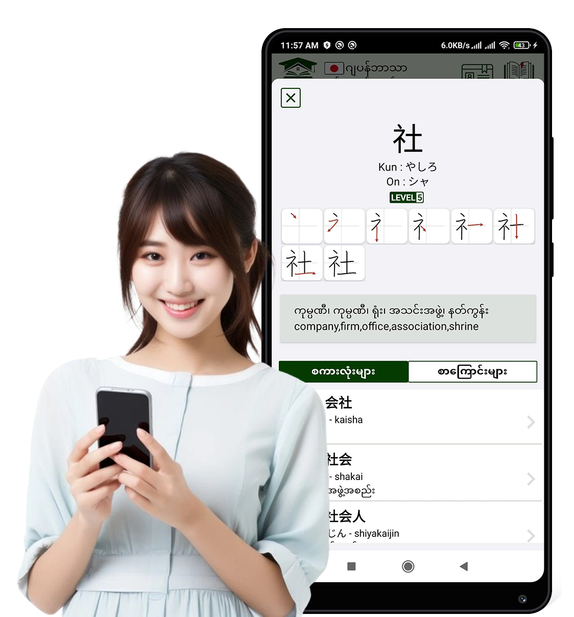 (N5 to N1 အက္ခရာဆွဲချက်၊ ဥပမာစာကြောင်းများ၊ ဝေါဟာရ 2500 ကျော်)